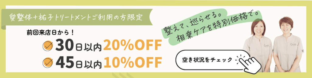 特に下半身の疲れや張り感(腰、お尻、股関節周り、ふくらはぎ)やむくみや冷え、だるさが気になる方はこちらのメニューがおすすめです。